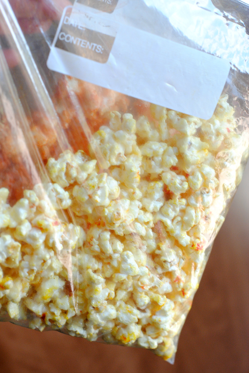 Shake vigorously and use your hands to smoosh it around a little to get the color to cover the popcorn.