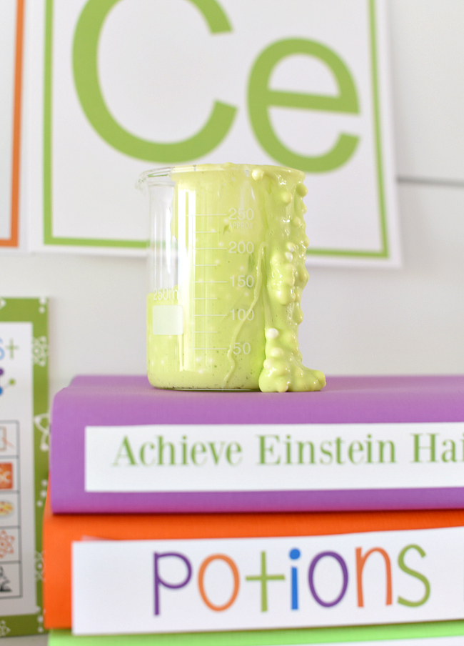 We just used an easy recipe for the slime that we found online, but you can use any recipe that you love. Let the kids make this with you as a fun activity to do during the party, then they can take it home with them at the end. And storing it in a beaker just adds to the fun.
