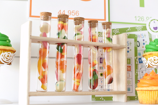 No party is complete without a fun party favor for your guests. We fell in love with these test tubes and knew we needed to incorporate them into our party. It was such an easy fit to use them as our party favors and they could not be simpler. We have this cute science tag for you all ready to print, all you need to do it fill the test tubes with candy and add the tag.