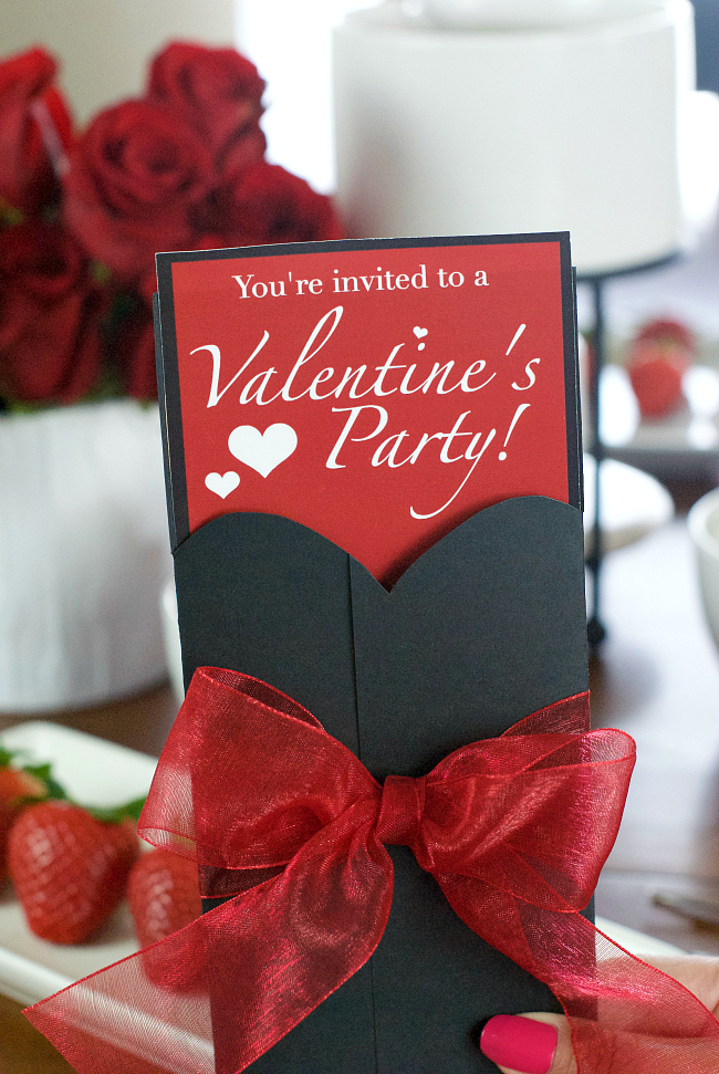 We wanted our invitations to be elegant to match the party. We printed out a red invitation and then wrapped it in black card stock (and cut a heart shape in the top) then tied it with red ribbon.